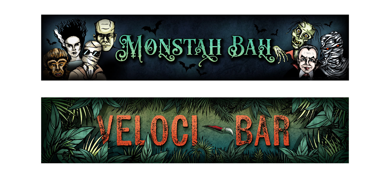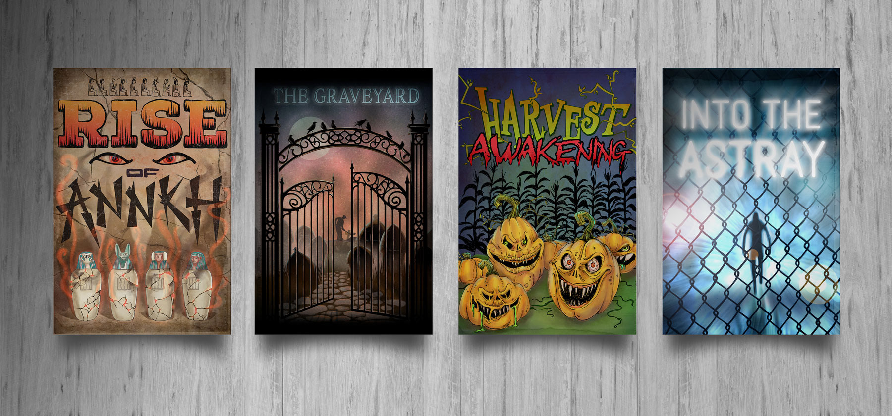 Illustrated posters for areas inside the haunt